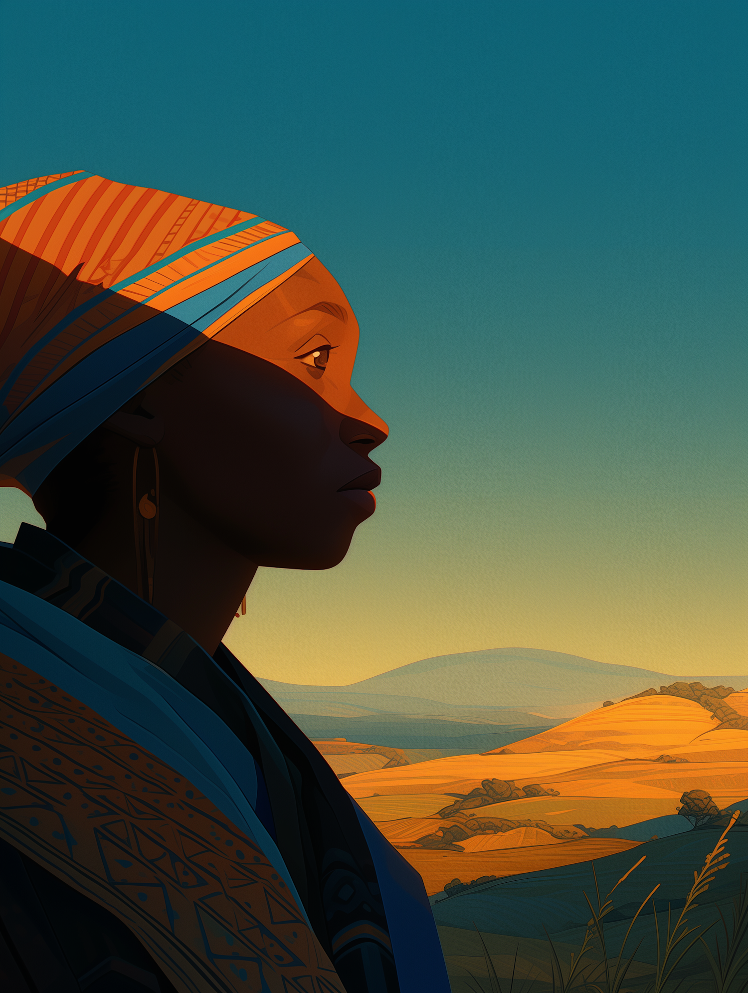Illustration of a Black woman in profile with a vibrant headscarf, set against a serene landscape of rolling golden hills.