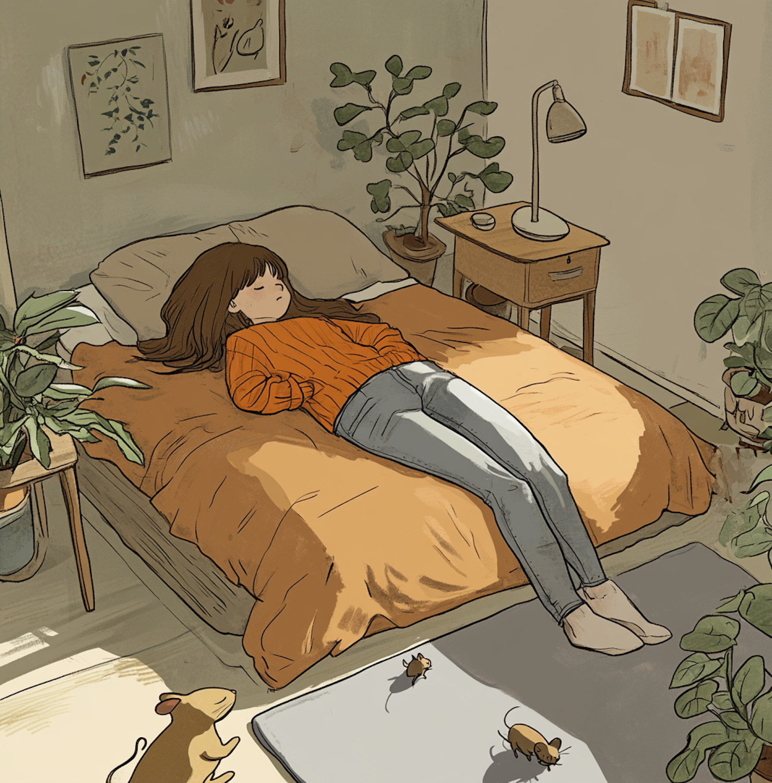 A girl in an orange sweater relaxes on a bed in a plant-filled room, with a dog and mice playing on the floor.