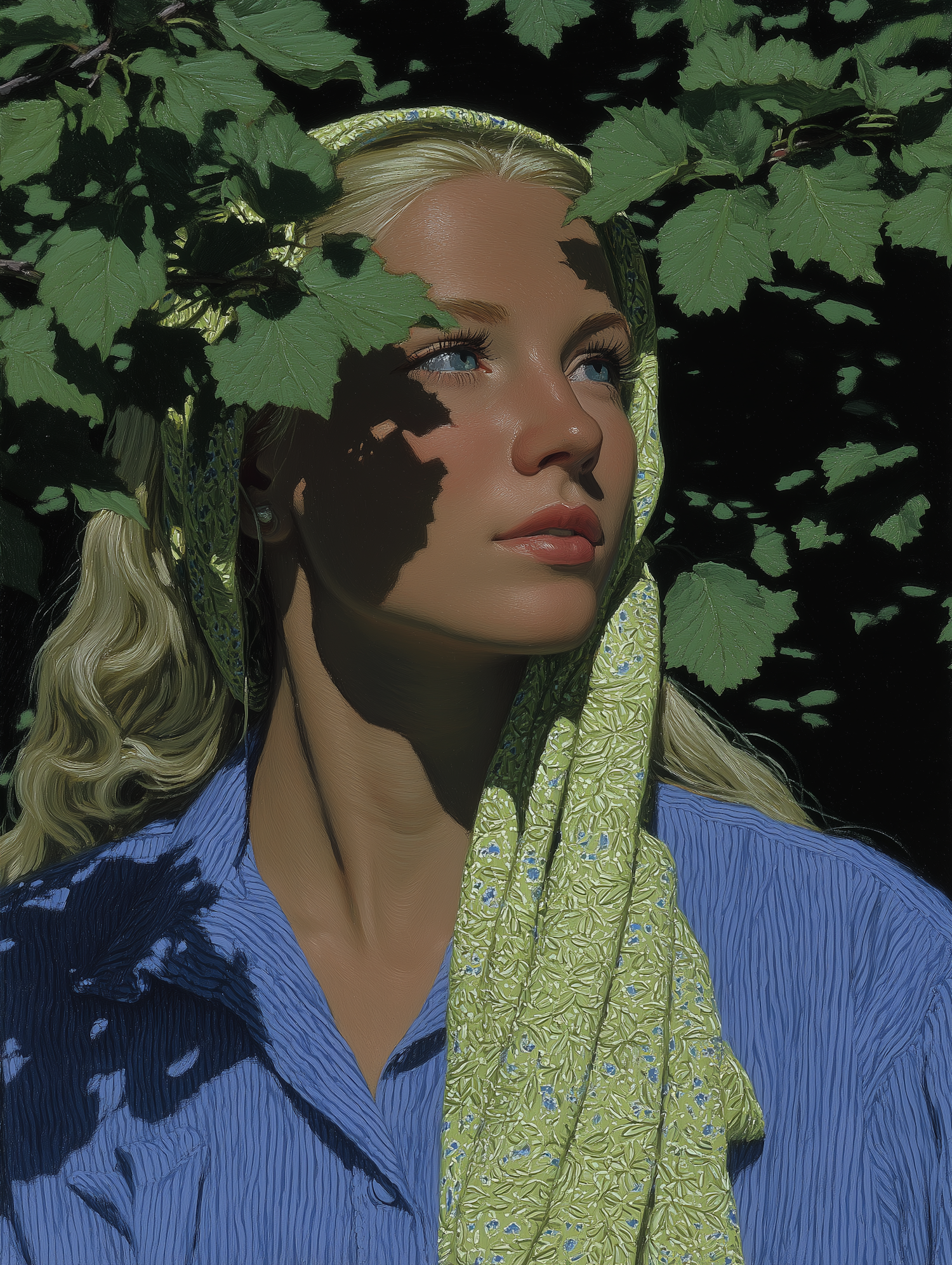 A serene portrait of a woman in a blue shirt and green scarf, surrounded by leaves with sunlight casting intricate shadows.