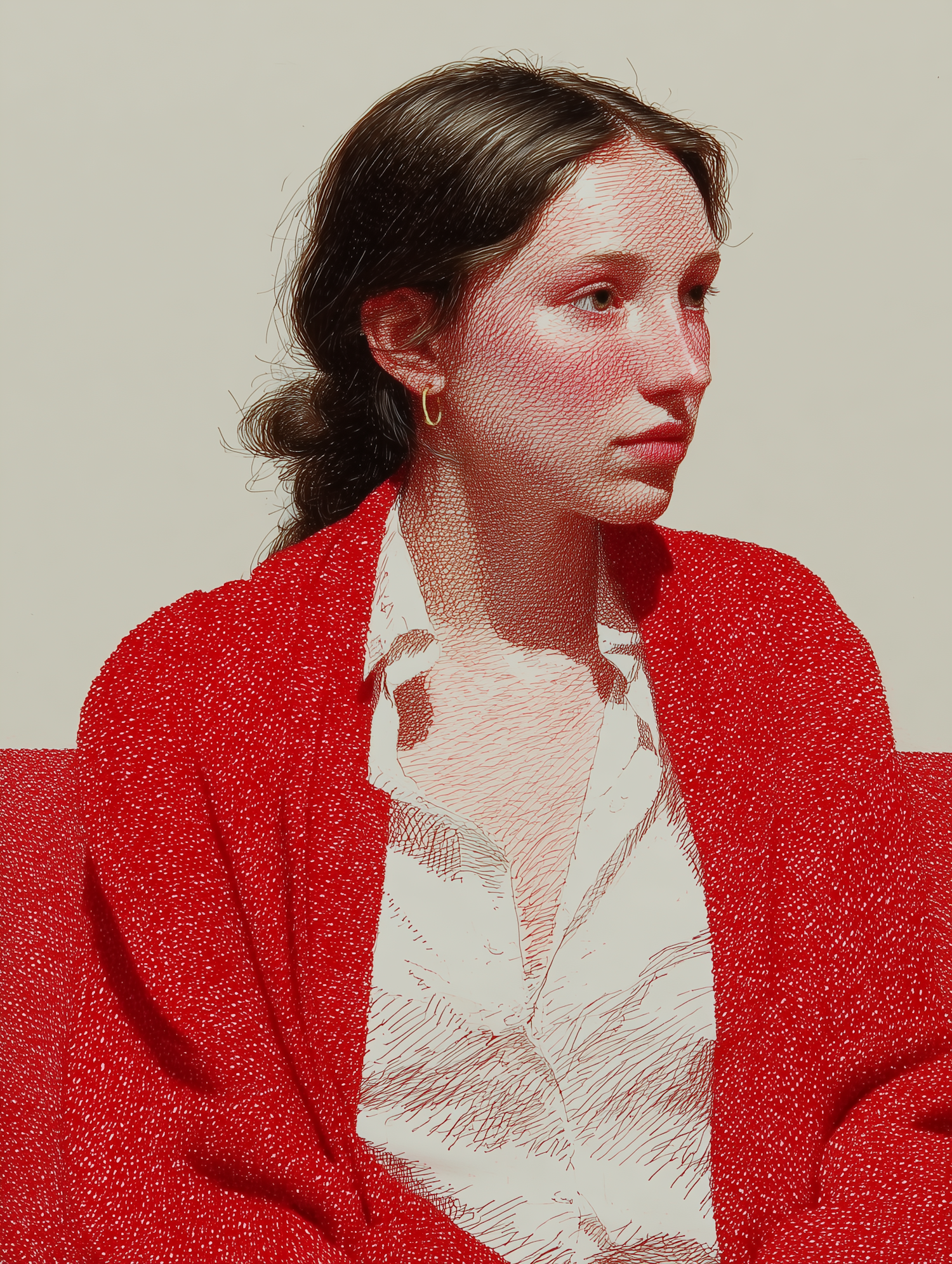 A detailed illustration of a woman in a red shawl and white shirt, with a calm expression and a neutral background.