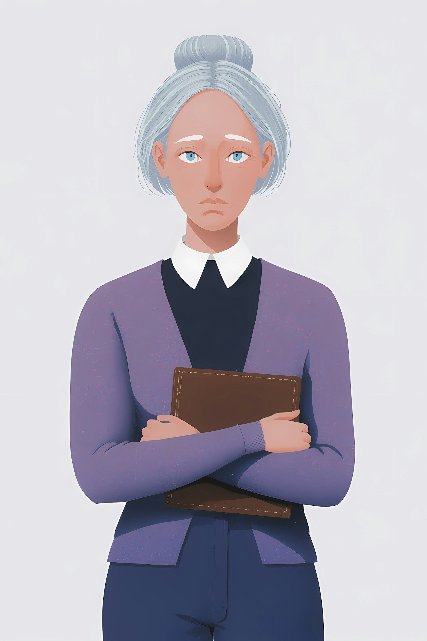 Illustration of a woman with light blue hair holding a book, wearing a purple cardigan and navy shirt, set against a light gray background.