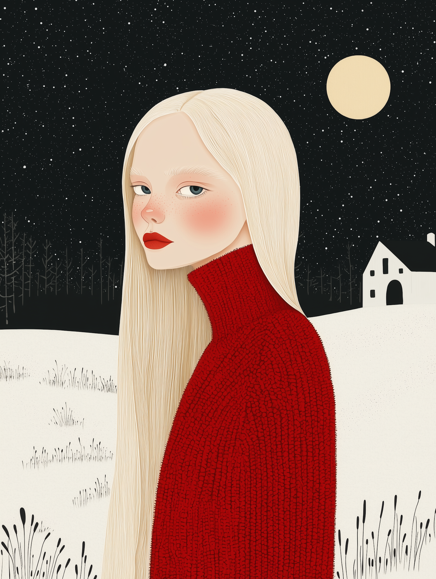 Illustration of a blonde woman in a red sweater against a snowy night landscape with a starry sky and moon.