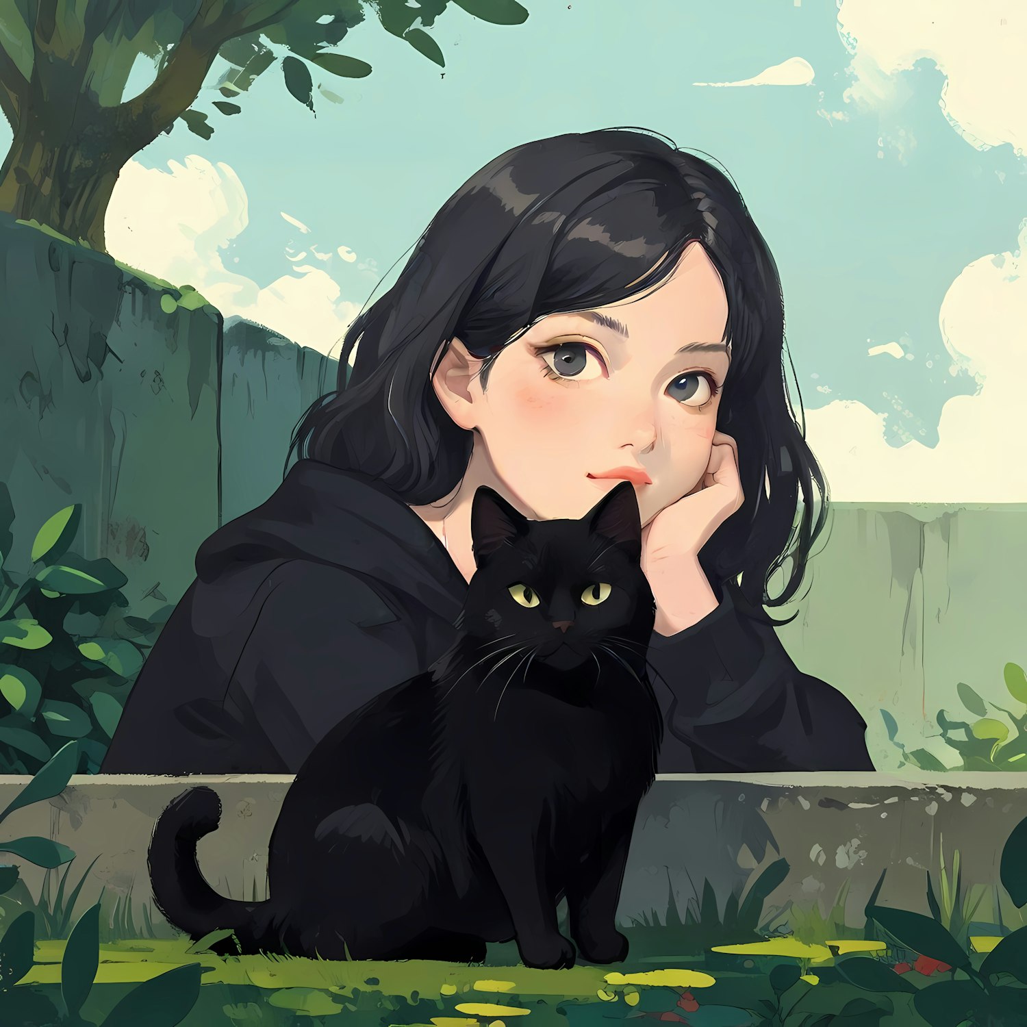 A thoughtful woman with black hair and a black cat in a serene outdoor setting, surrounded by lush greenery and a clear blue sky.