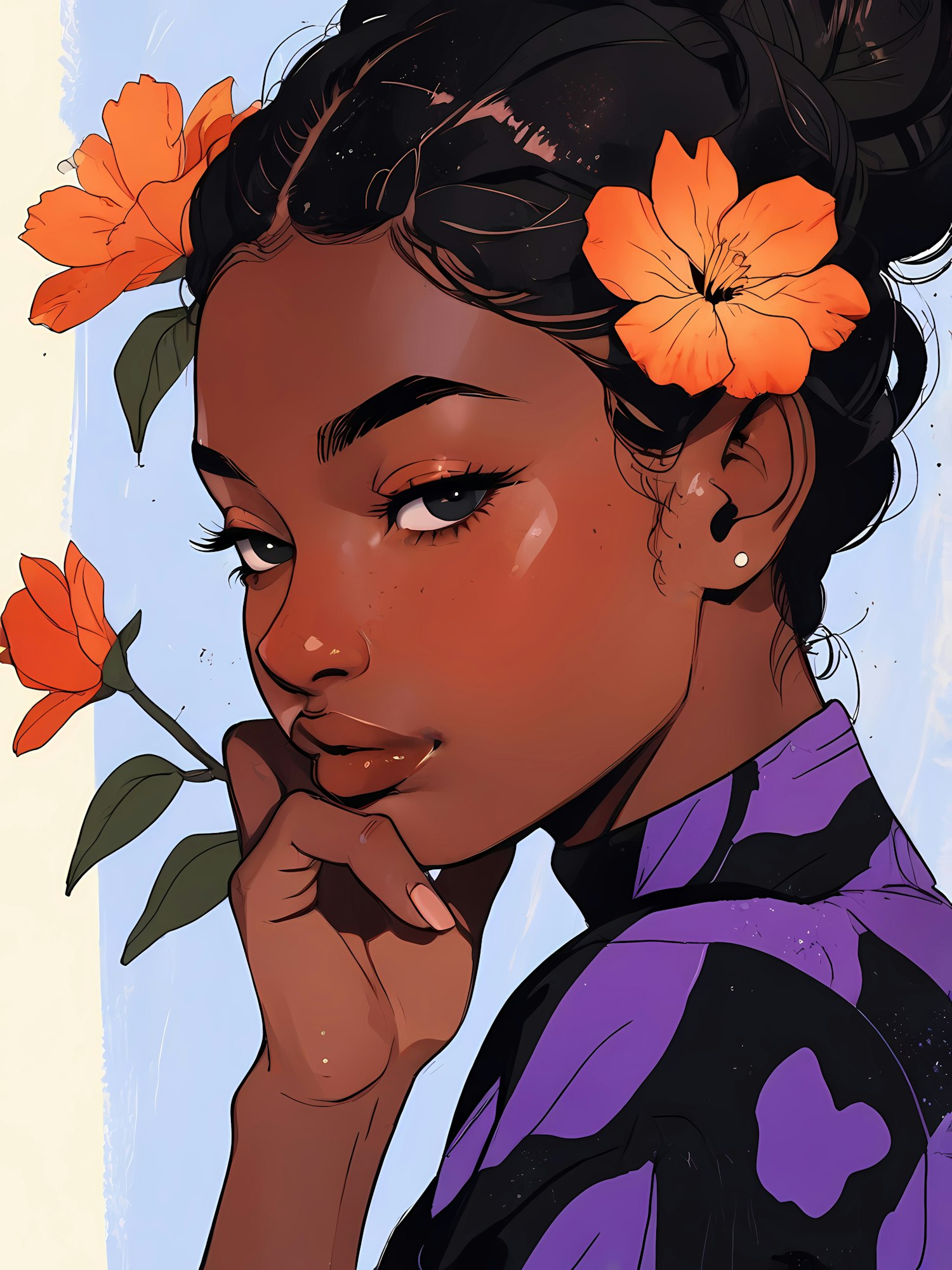 Elegant illustration of a young Black woman with orange flowers in her hair, wearing a purple outfit against a soft blue background.