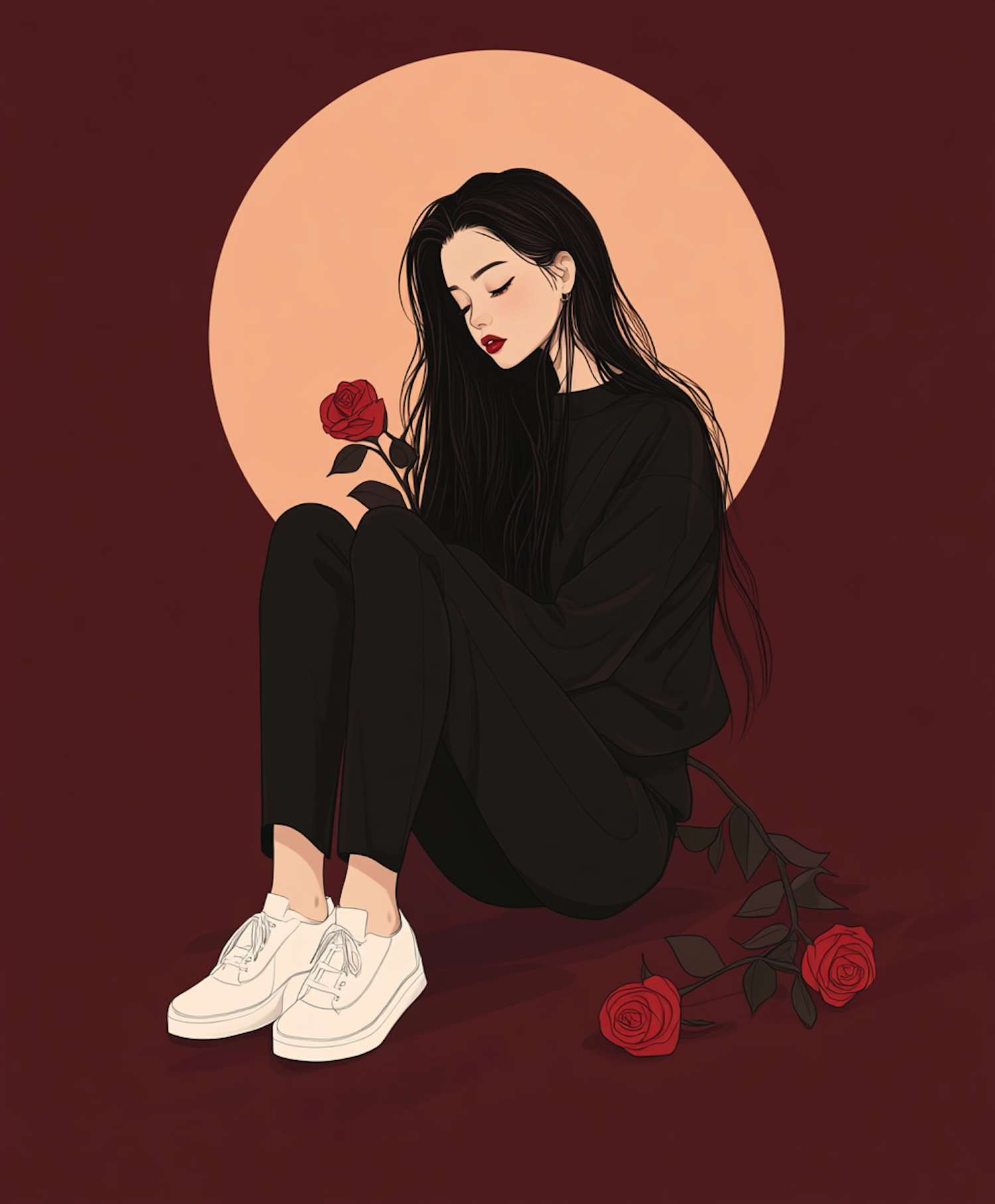Illustration of a serene woman with black hair holding a red rose, set against a peach circle and maroon background.