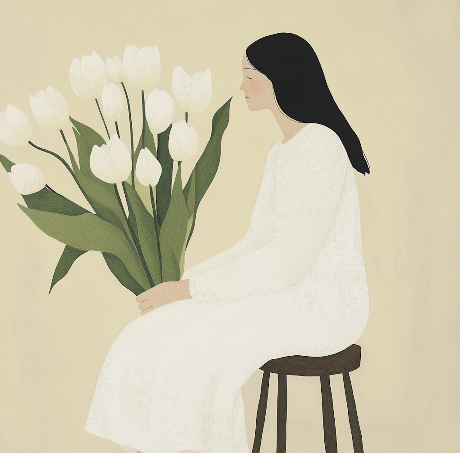 Minimalist illustration of a woman in a white dress holding a bouquet of white tulips, sitting on a stool against a beige background.