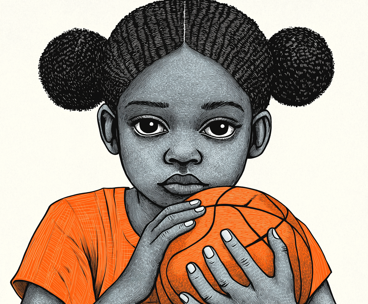 Illustration of a young girl with textured hair holding a basketball, wearing an orange shirt. Detailed line work and expressive eyes.