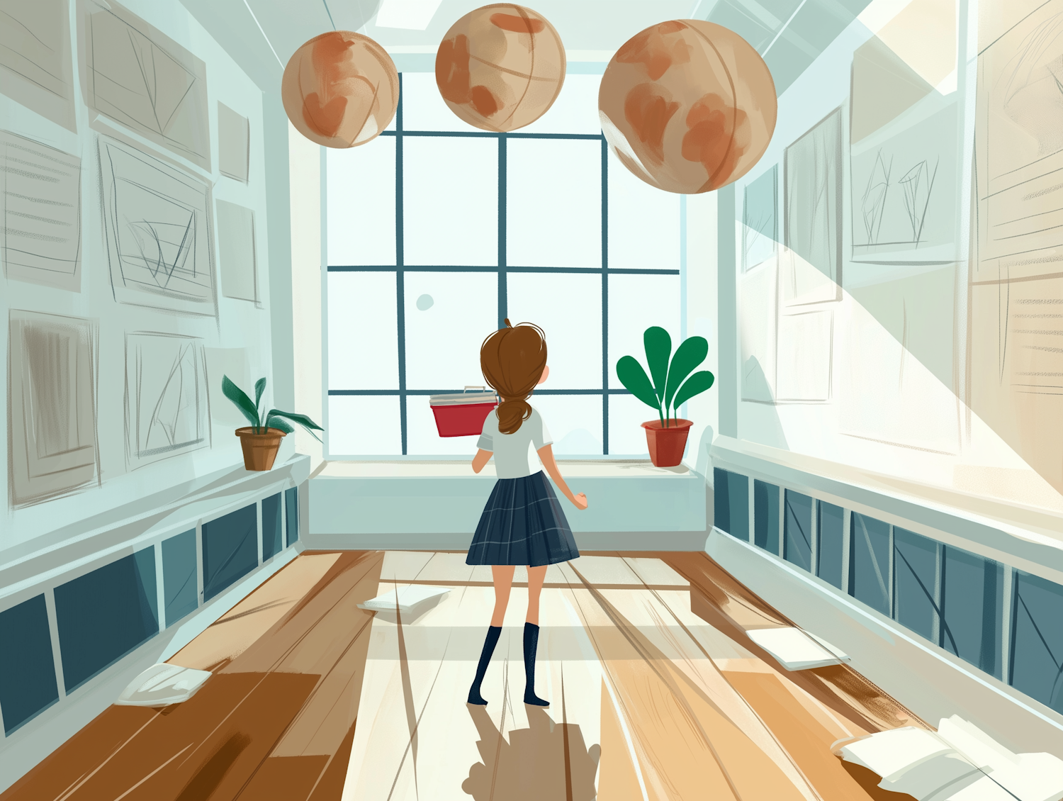A girl in a school uniform stands in a sunlit room with hanging planets, surrounded by sketches and plants, creating a creative ambiance.