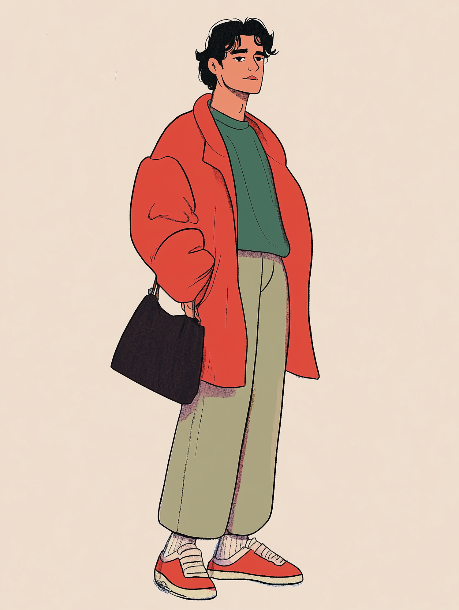 Stylish illustration of a young man in a red jacket, green sweater, and beige pants, holding a black bag. Fashion-forward and confident.