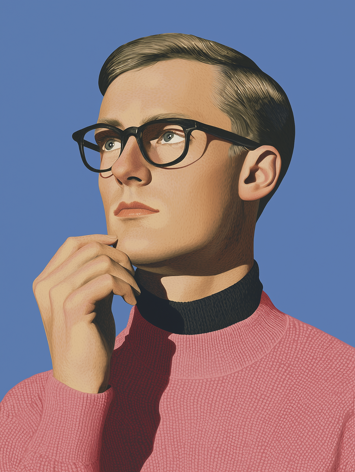 Stylish portrait with a blurred face, featuring a pink sweater, black turtleneck, and black glasses against a blue backdrop.