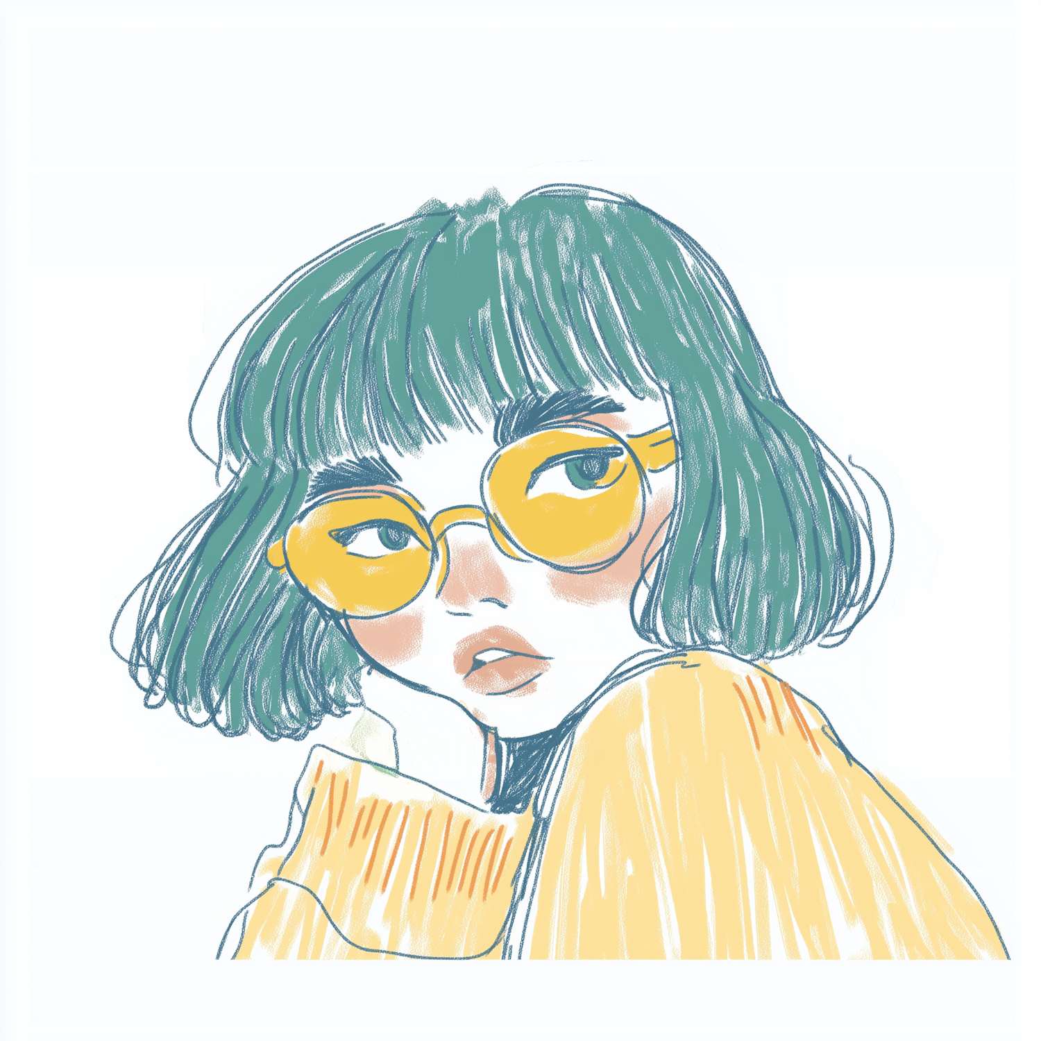Stylized illustration of a young woman with teal hair, yellow glasses, and a cozy sweater. Soft pastel colors create a modern, artistic vibe.