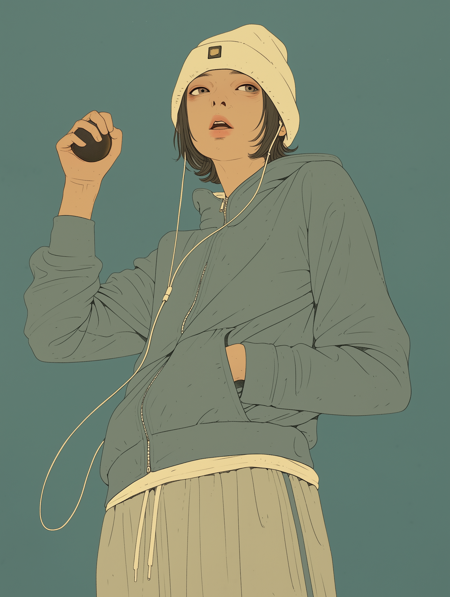 Illustration of a young woman in a beanie and hoodie, holding a black object, with earphones in. Minimalist style with teal tones.