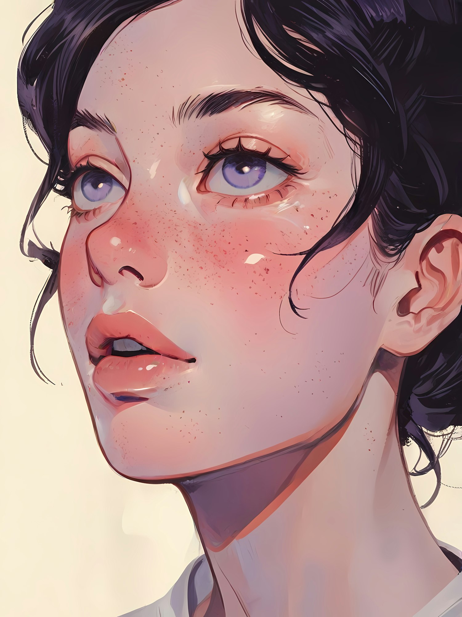 Ethereal digital illustration of a young woman with blue eyes, freckles, and dark wavy hair against a soft neutral background.