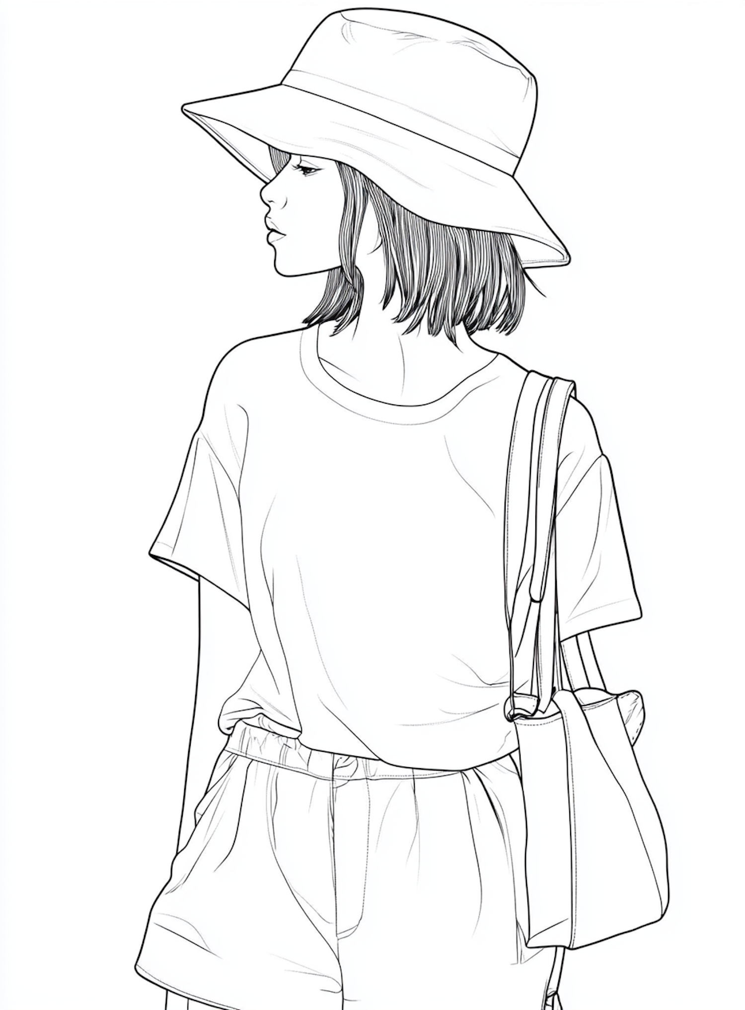Line drawing of a woman in a hat, t-shirt, and shorts, carrying a tote bag. Simple and stylish illustration.