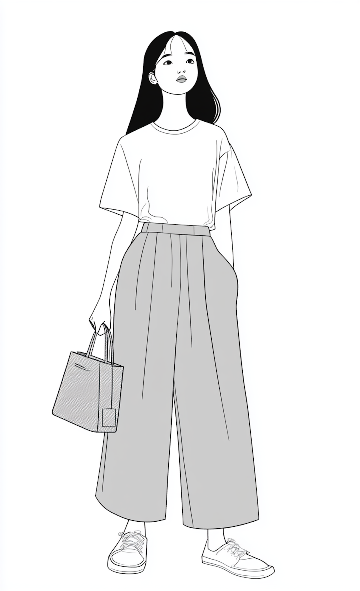 Stylish illustration of a young woman in a white T-shirt and gray pants, holding a handbag. Minimalist and chic fashion sketch.