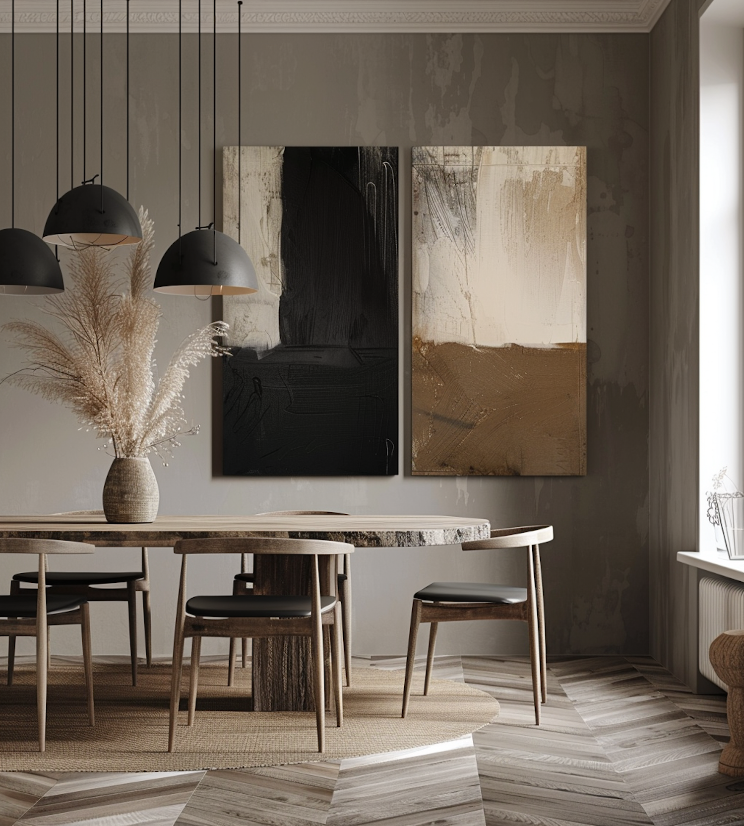 Modern dining room with rustic table, abstract art, and pampas grass. Black pendant lights and natural tones create a cozy atmosphere.