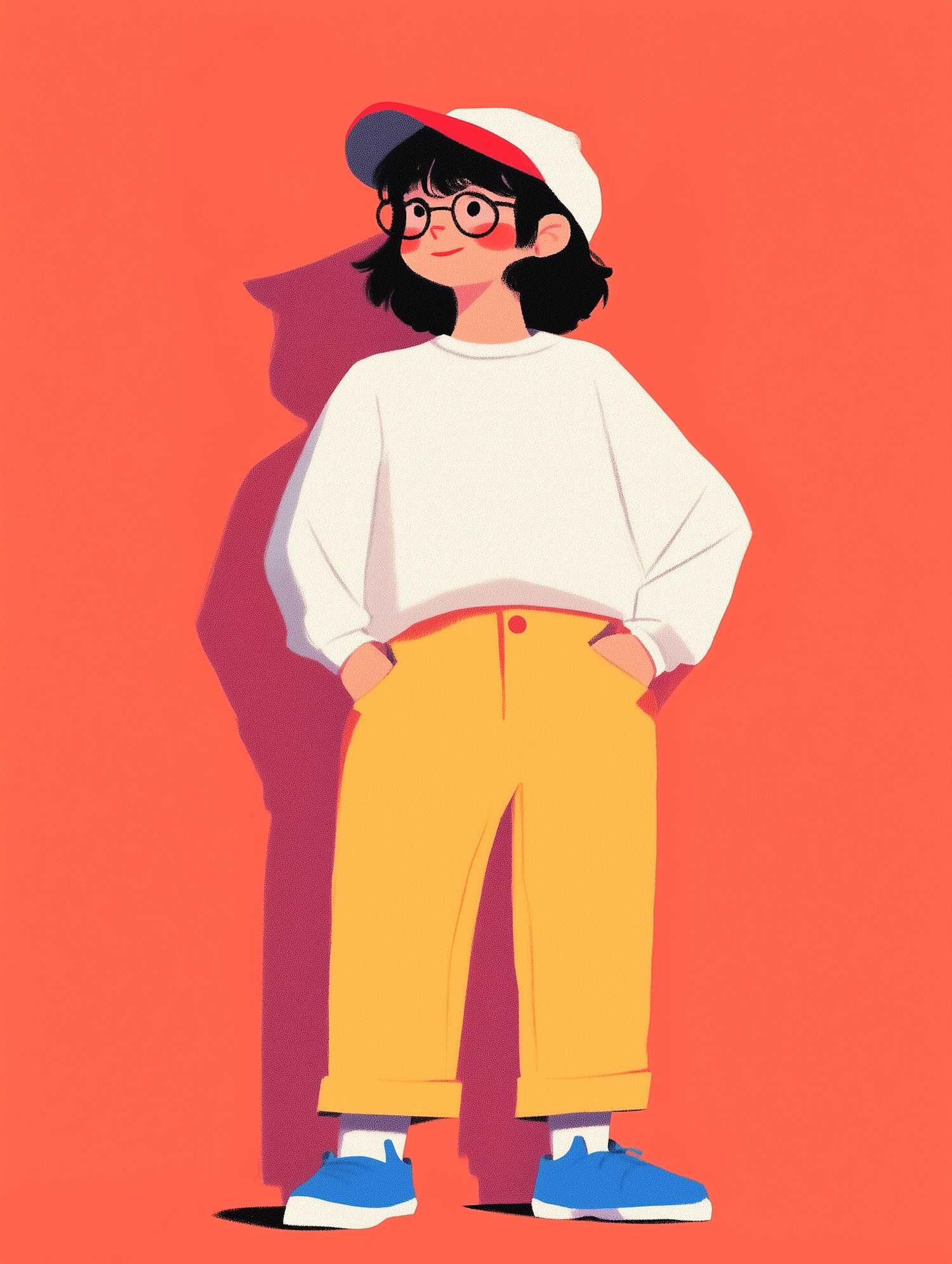 Cartoon illustration of a stylish person in yellow pants and a white cap, set against a vibrant orange background.