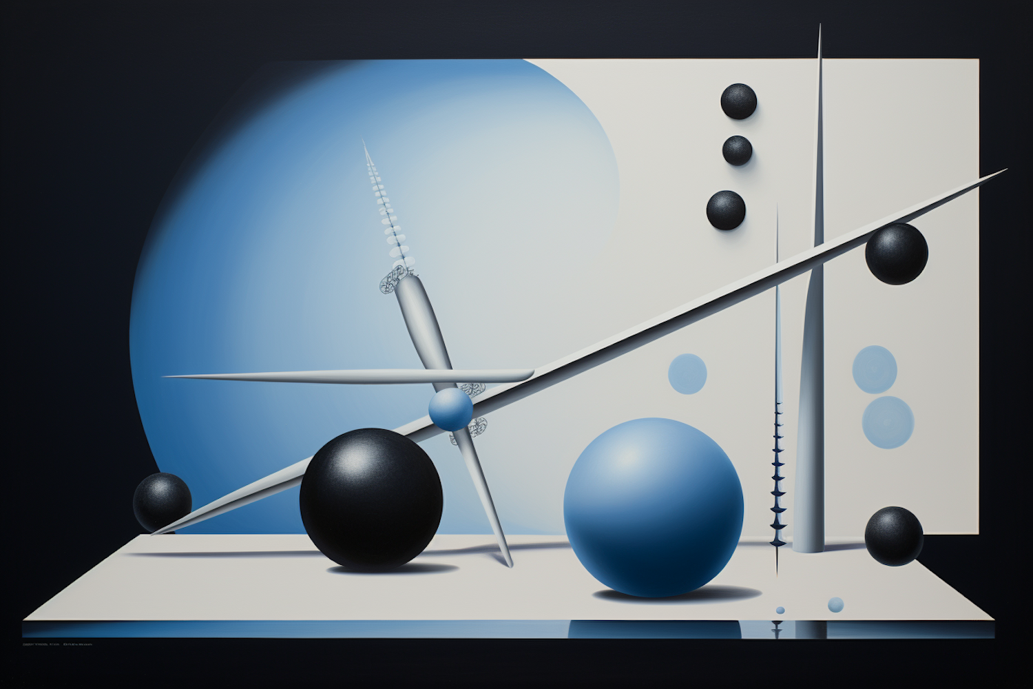 Abstract geometric composition with blue and black spheres, intersecting spikes, and a gradient background. Futuristic and minimalist design.