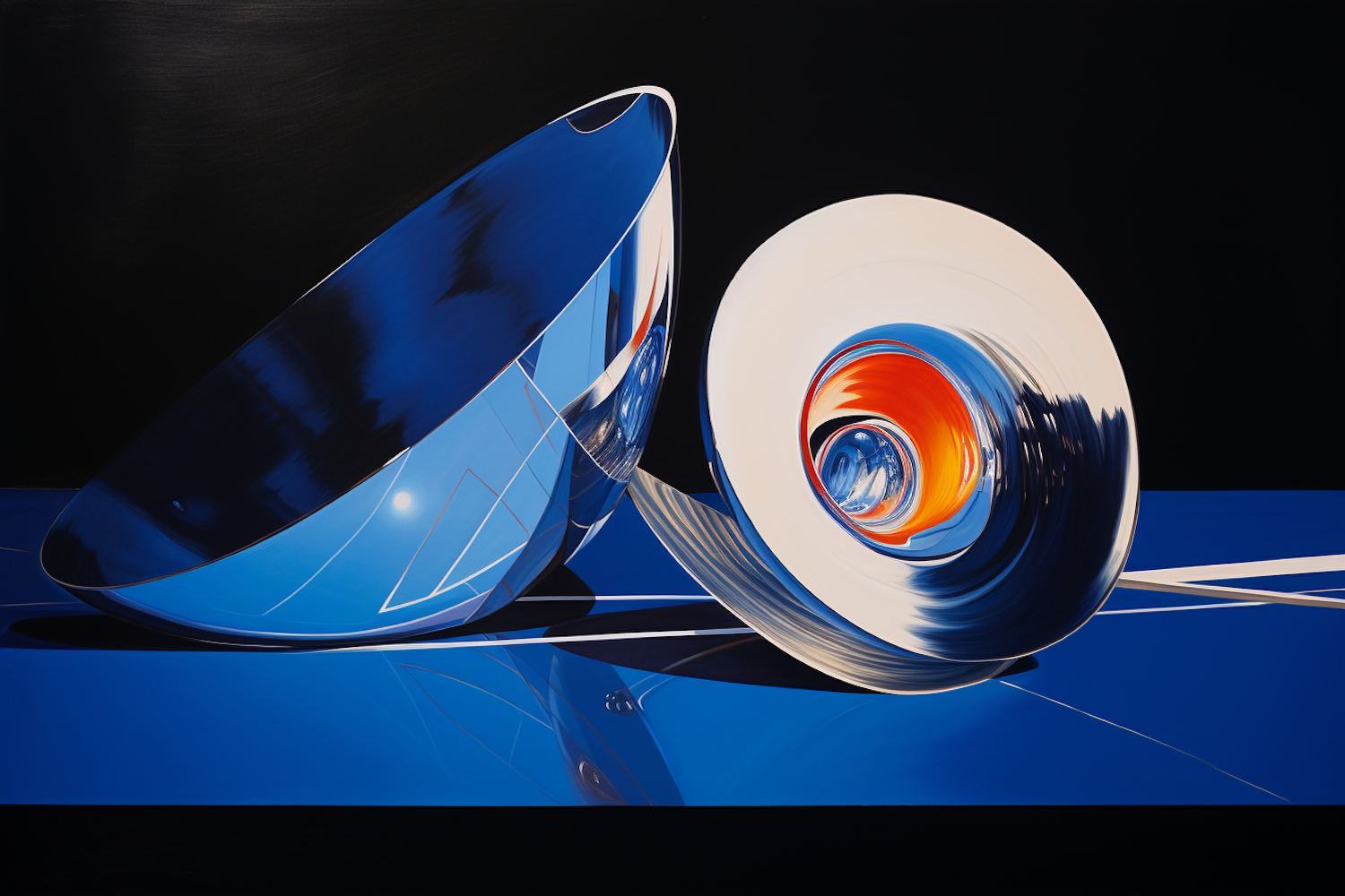 Abstract art with reflective blue and white objects, featuring dynamic spirals and geometric patterns on a black background.