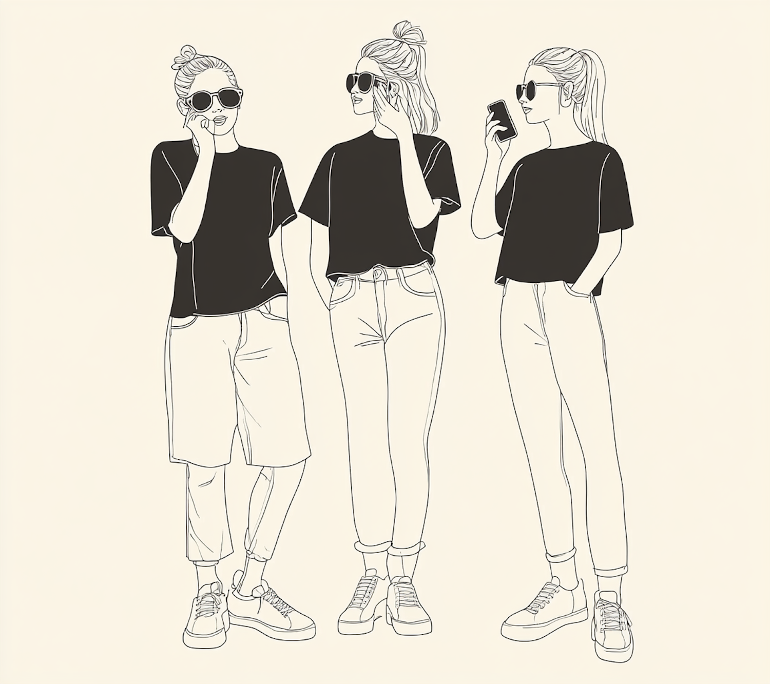 Minimalist illustration of three women in black t-shirts and sunglasses, each with unique hairstyles and poses, set against a plain background.