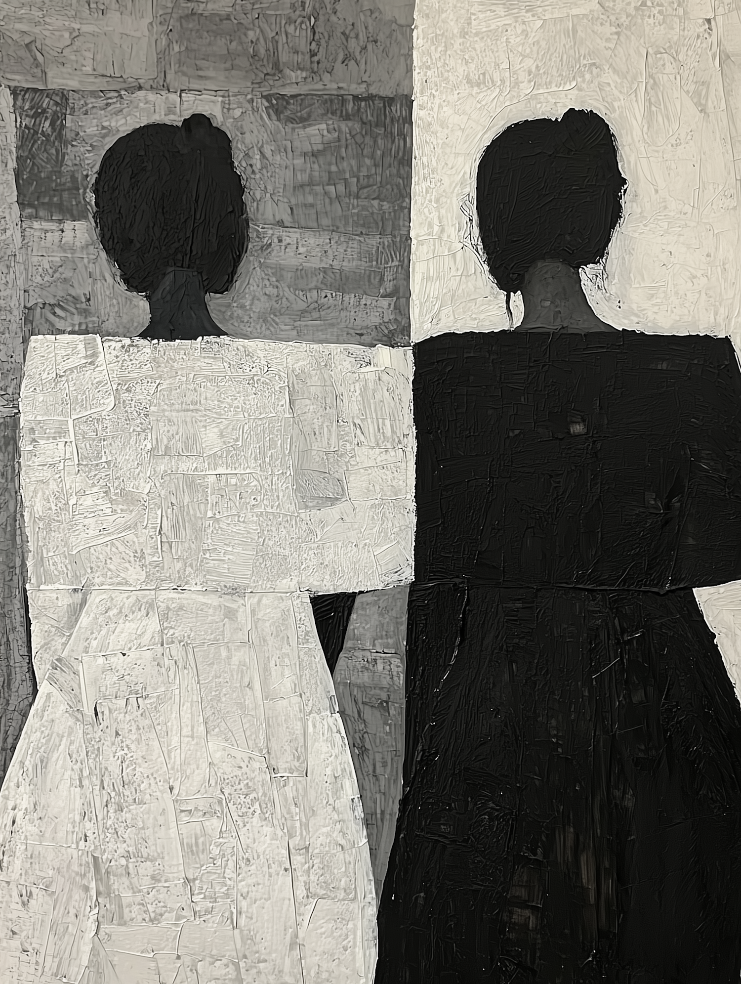 Minimalist painting of two figures in contrasting black and white outfits, facing away. Textured, impasto style with a focus on symmetry.