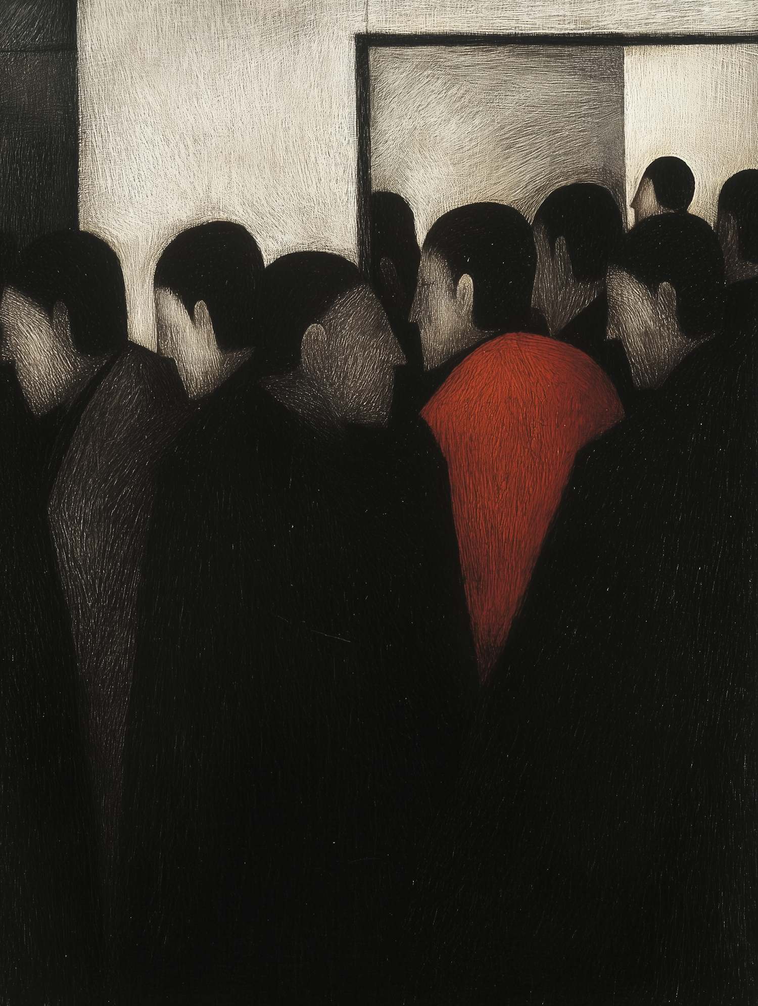 A striking illustration of faceless figures in dark attire, with one in red, highlighting individuality amidst uniformity.