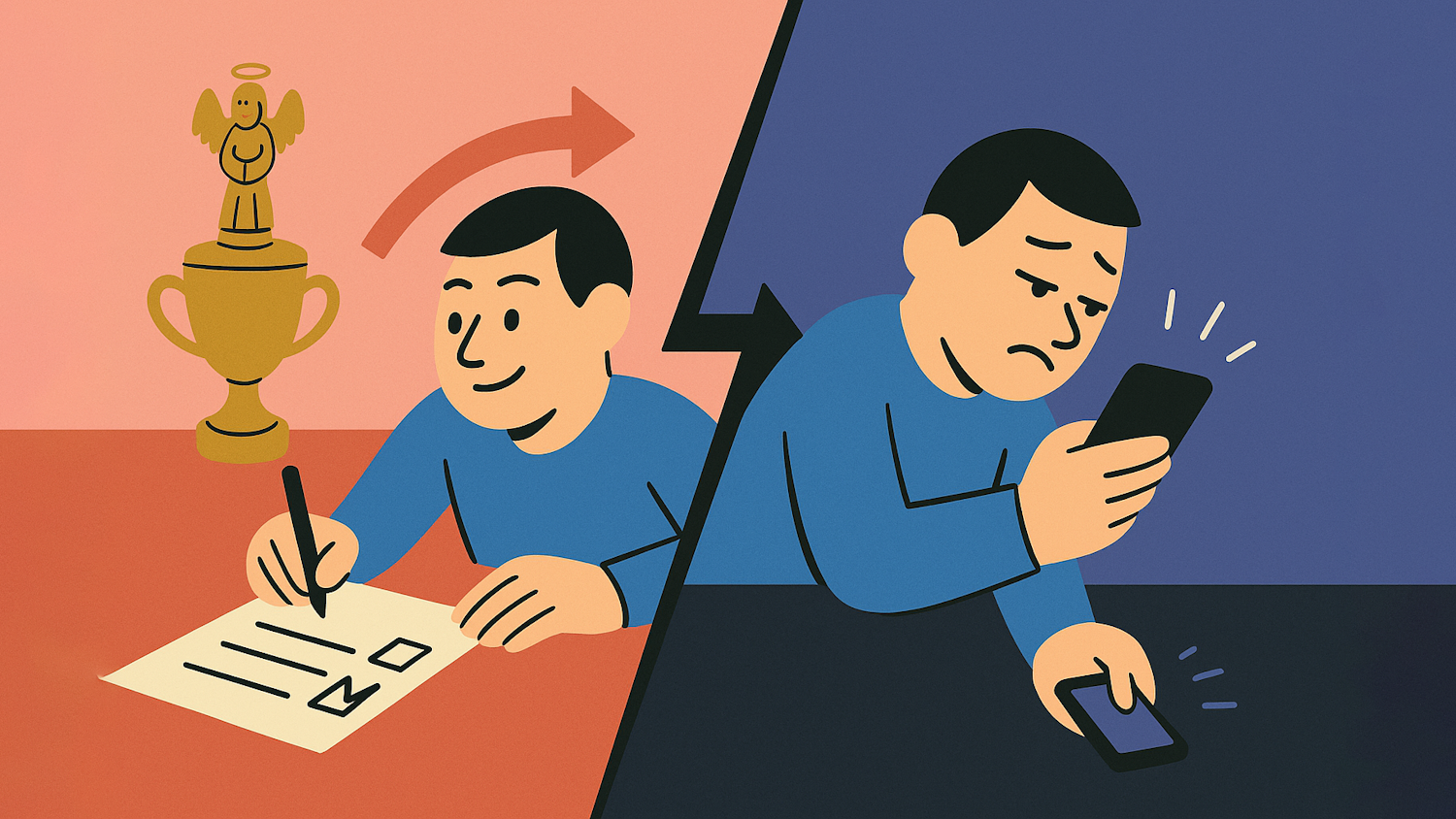 Illustration of a man experiencing success and sadness, symbolized by a trophy and a phone, with contrasting warm and dark backgrounds.