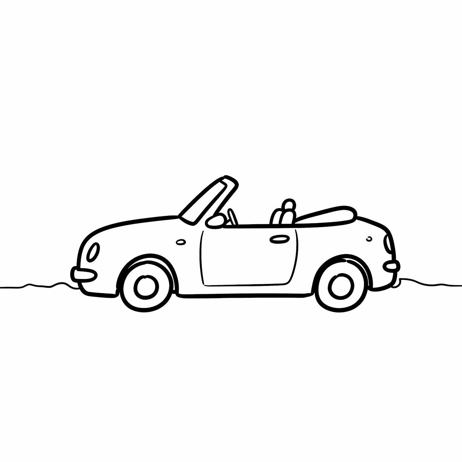 Minimalist line art of a convertible car in a side profile, showcasing its open roof and clean design on a plain white background.