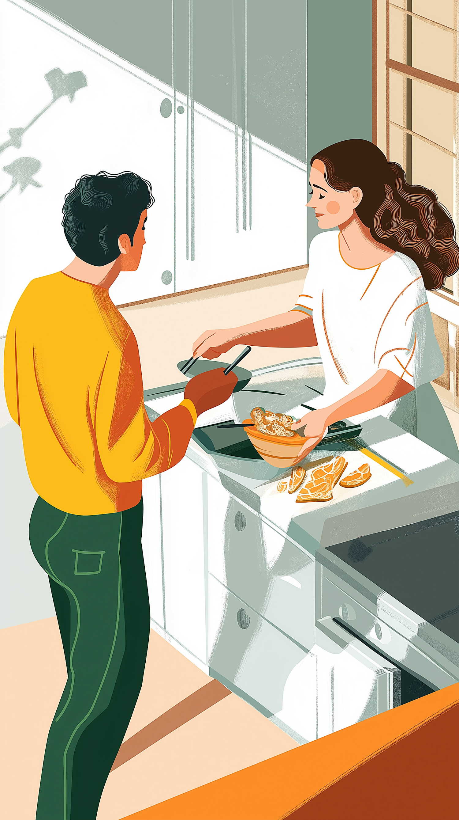 A man and woman cooking together in a modern kitchen, sharing tasks and preparing food with a warm, collaborative vibe.