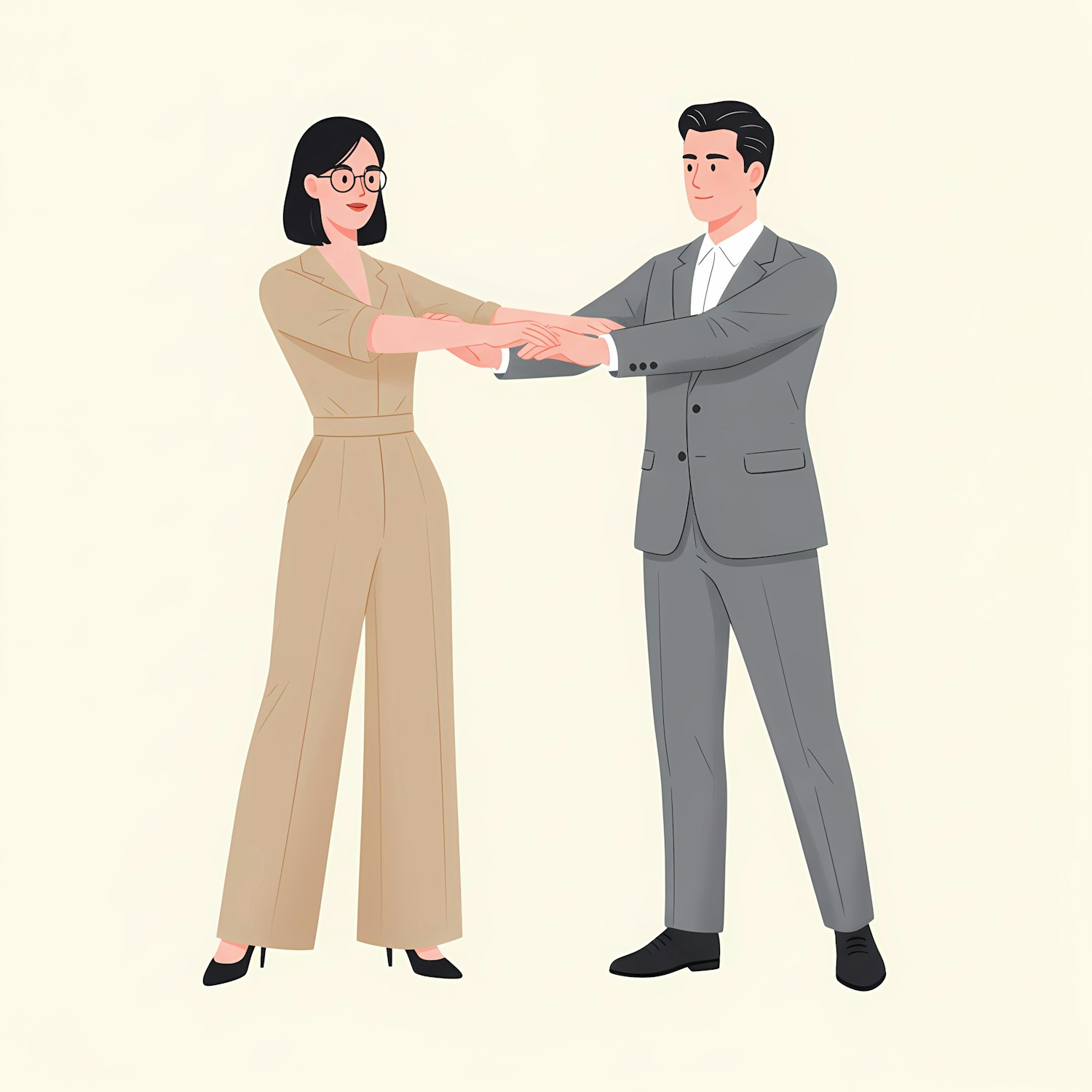 Illustration of a man and woman in formal attire holding hands, symbolizing teamwork or agreement, on a light background.