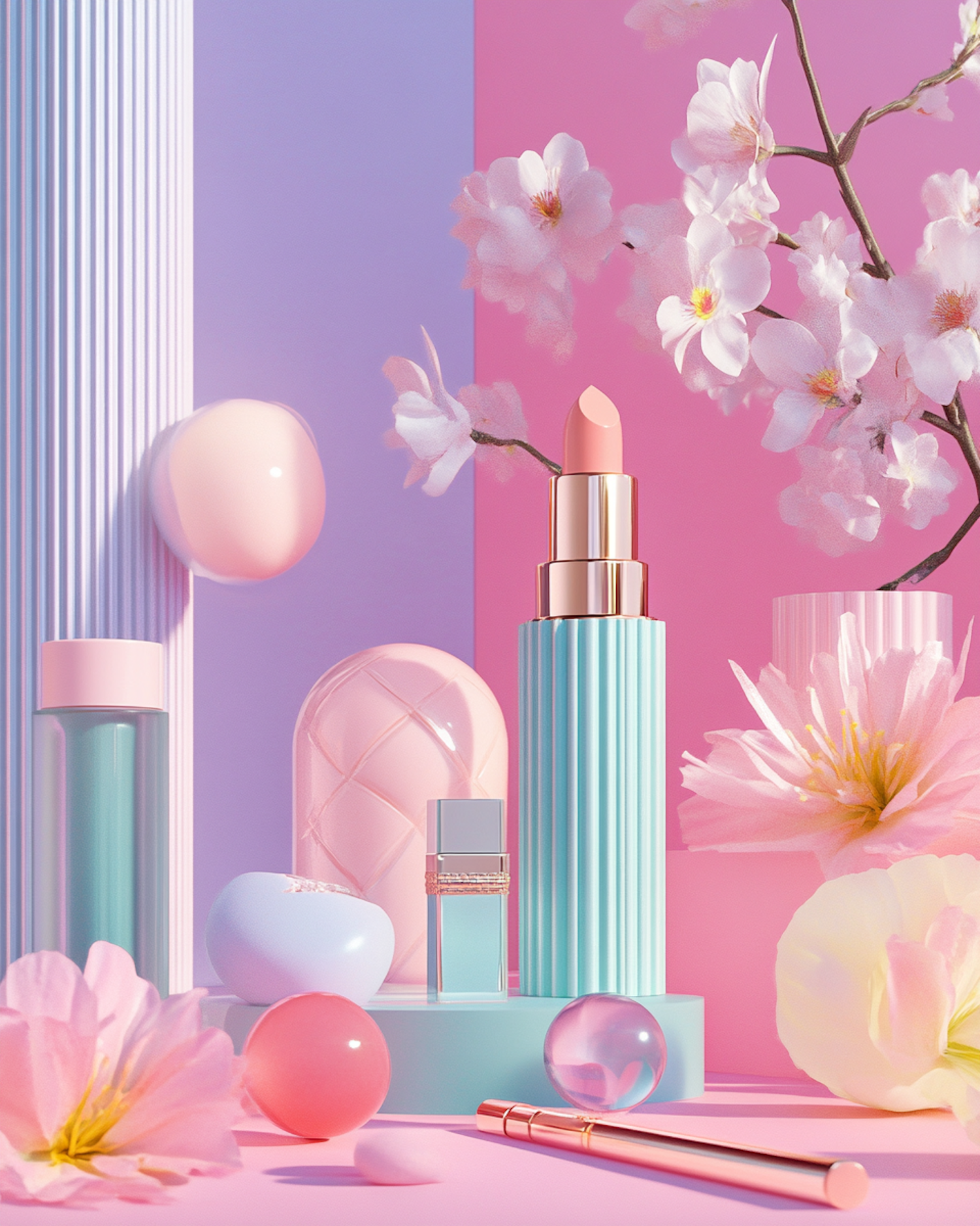 Elegant pastel-themed cosmetic display with lipstick, perfume, and cherry blossoms on a pink and purple gradient background.
