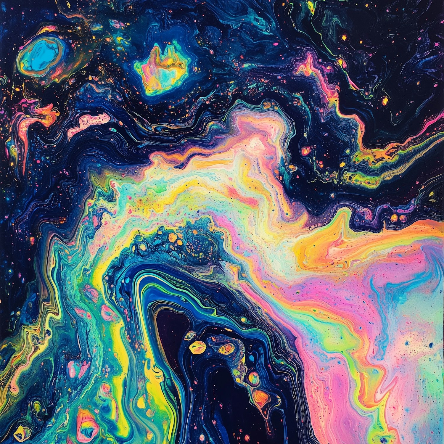 A stunning abstract painting with neon swirls of pink, yellow, green, and blue on a dark background, resembling a cosmic galaxy.