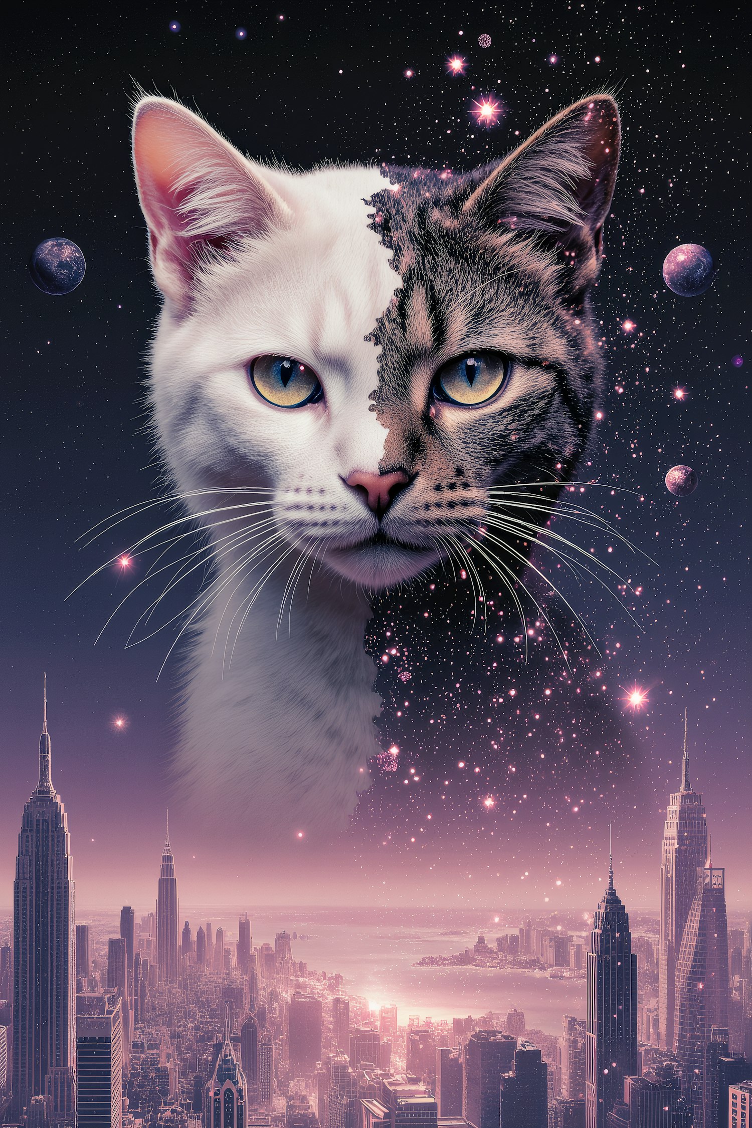 A surreal cat illustration with a cosmic background and a cityscape below, blending urban and celestial themes in a dreamlike composition.