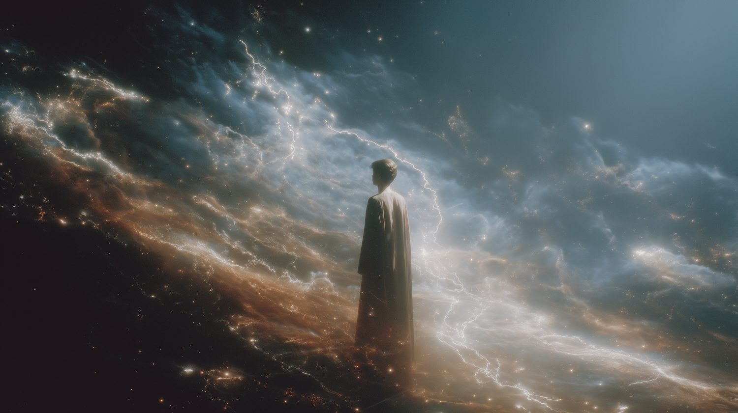 A lone figure stands in a cosmic expanse of swirling light and energy, surrounded by golden and blue hues with streaks of lightning-like light.