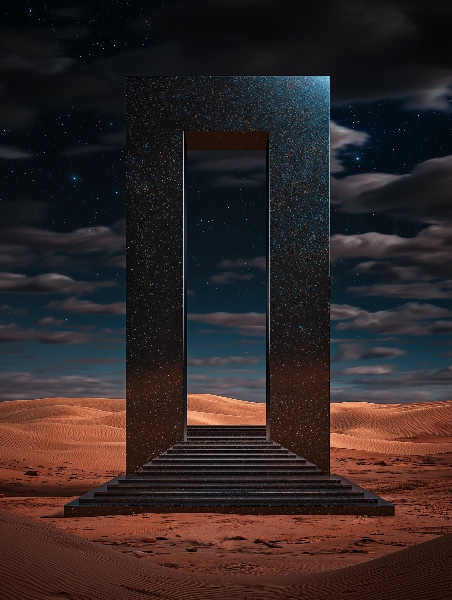 A cosmic monolith with a starry texture stands in a desert under a starry night sky, surrounded by smooth sand dunes and mystery.