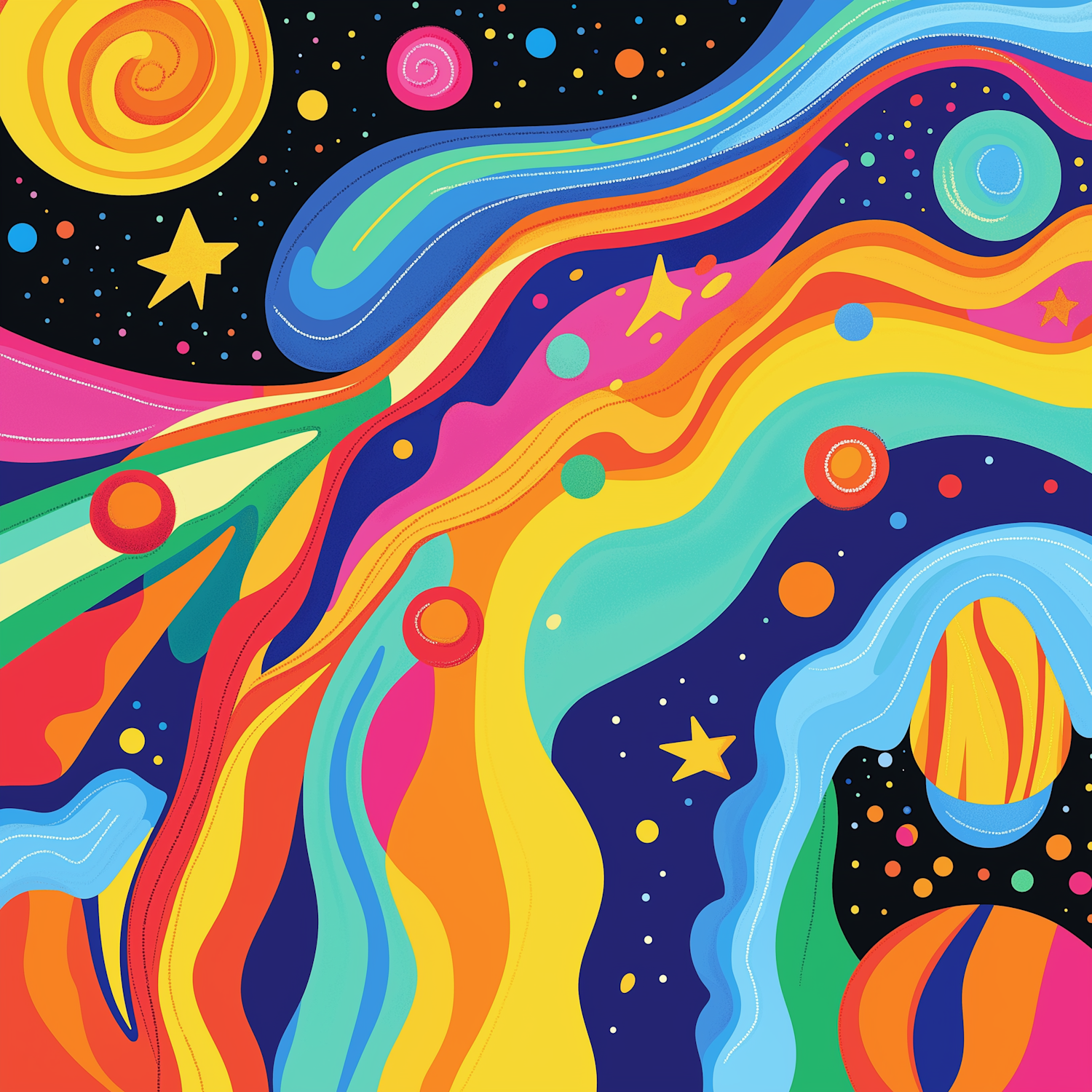 Vibrant abstract cosmic illustration with swirling colors, stars, and planets, creating a dynamic and lively space scene.