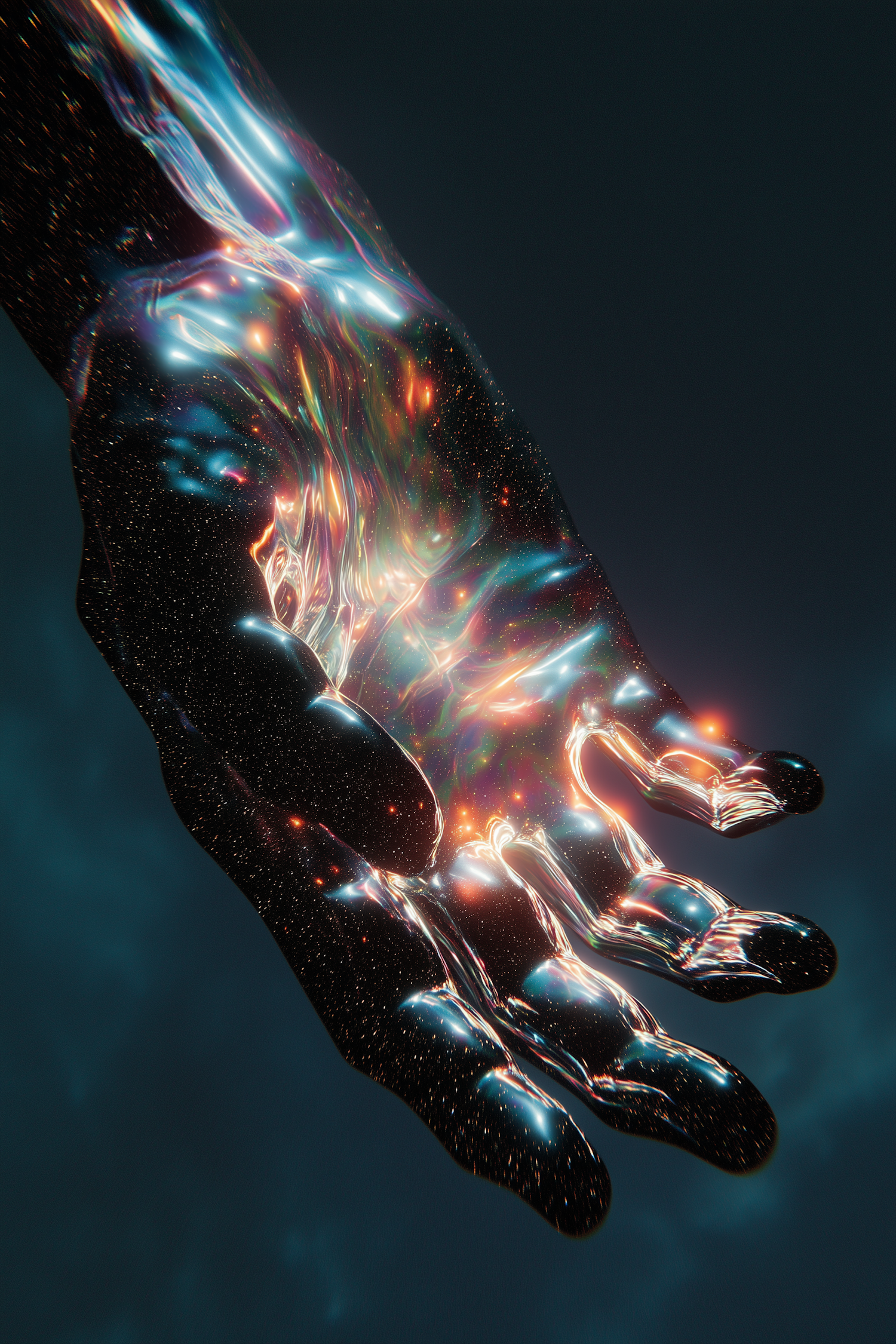 A surreal cosmic hand glowing with multicolored light, featuring a starry texture and a dark background for a mesmerizing effect.