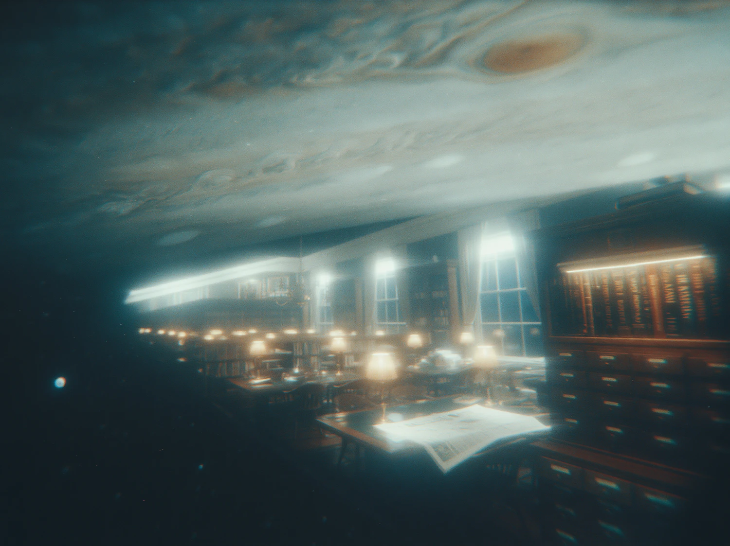 A surreal library scene with glowing lamps and a celestial ceiling resembling Jupiter, blending the earthly and cosmic in a dreamlike setting.