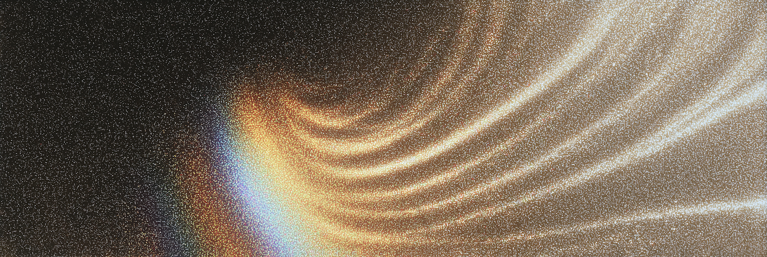 Abstract wavelike swirls of light in golden and rainbow hues blend against a dark, particle-speckled cosmic backdrop.