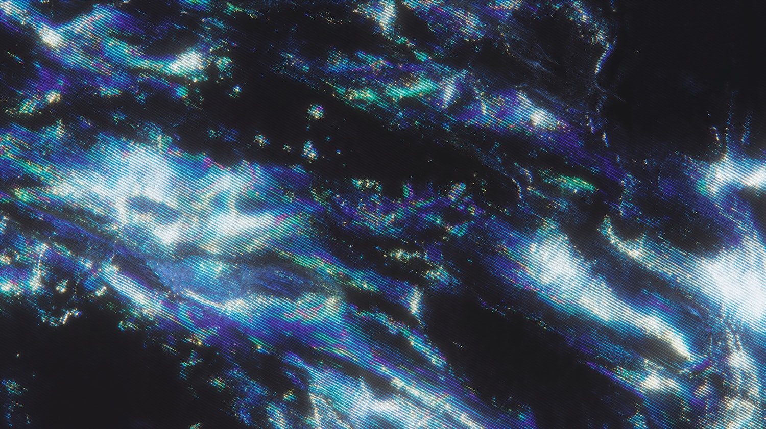 Abstract design with vibrant blue and white streaks of light against a black background, featuring an iridescent, cosmic-like appearance.