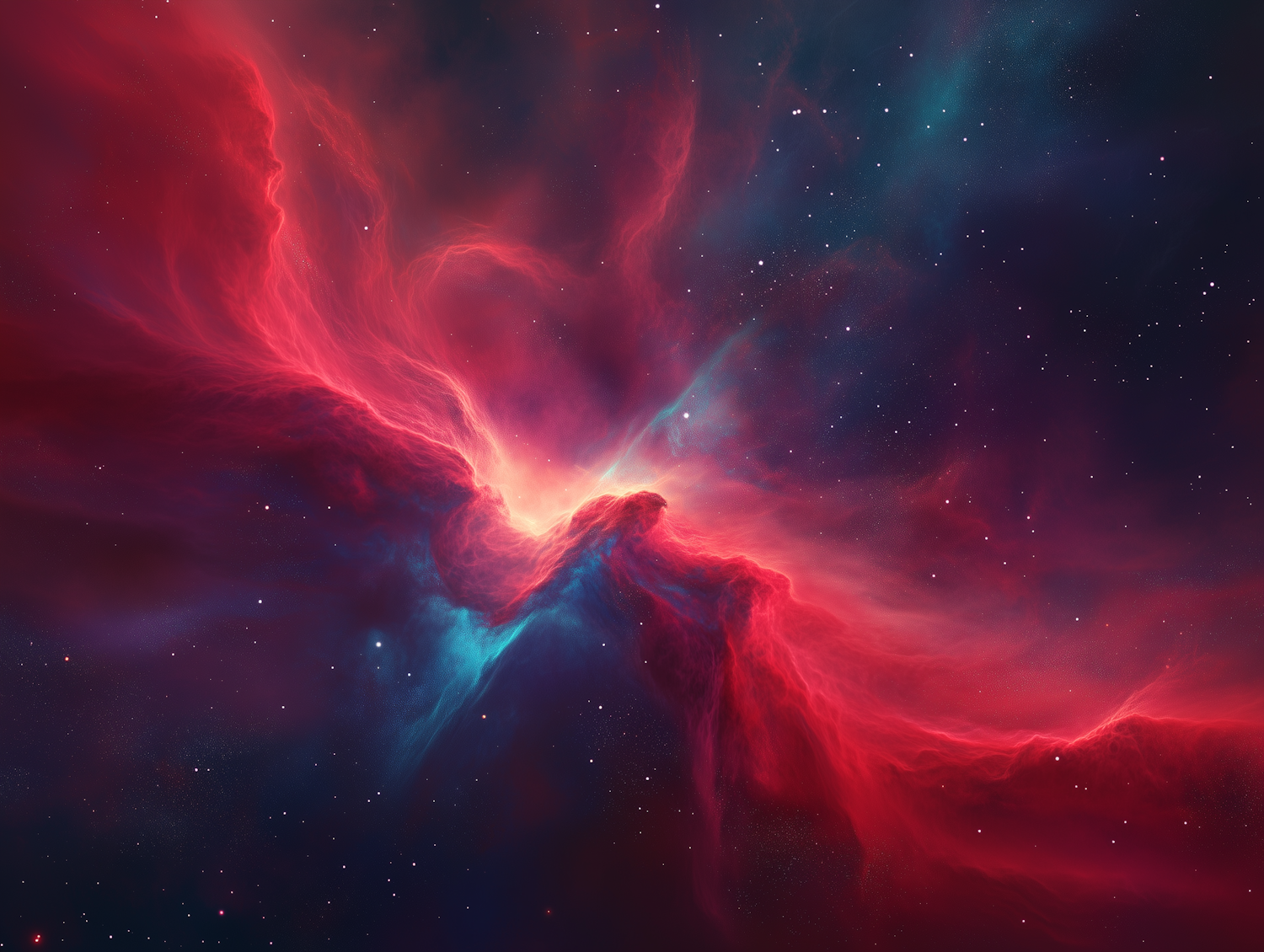 A stunning cosmic nebula with vibrant red and blue hues, illuminated by a radiant light source, surrounded by scattered stars.