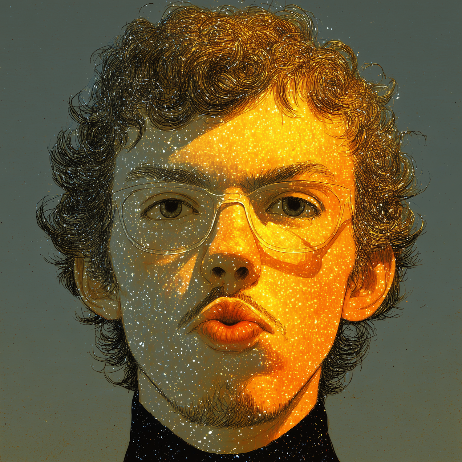 Stylized portrait of a person with glasses, glowing golden tones, and starry patterns, creating a surreal and cosmic aesthetic.