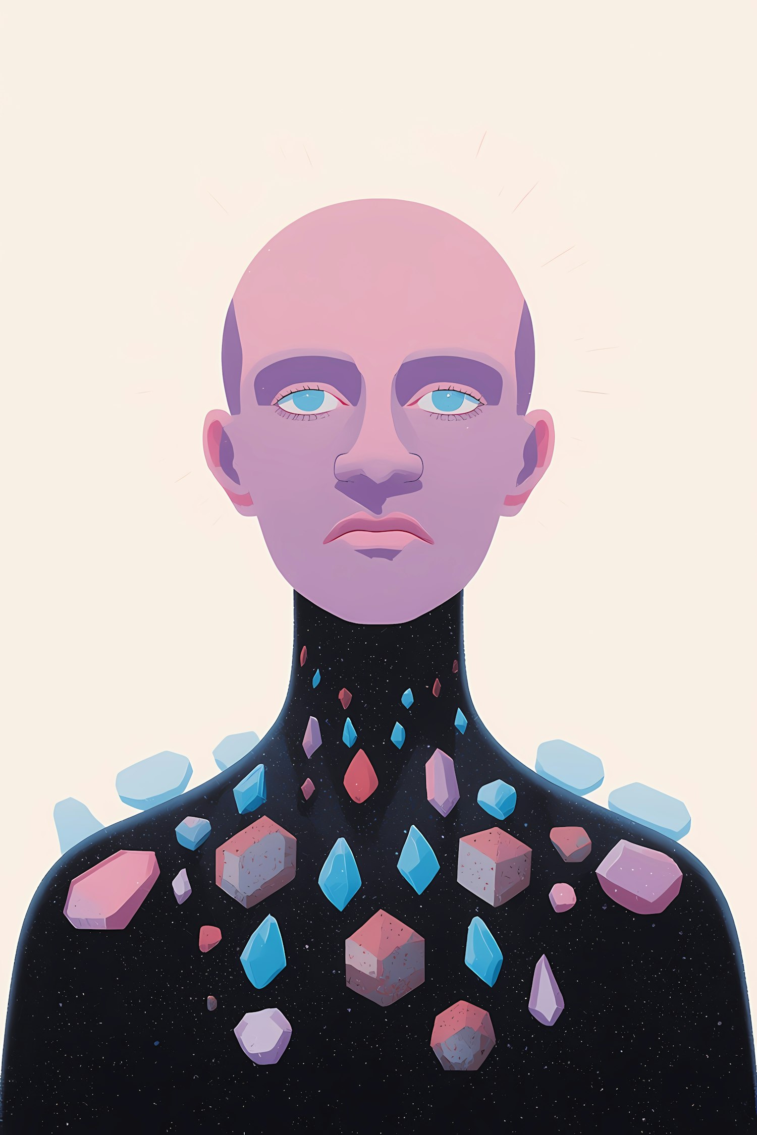 A surreal illustration of a cosmic-themed figure with vibrant crystals and a starry texture, set against a minimalist background.