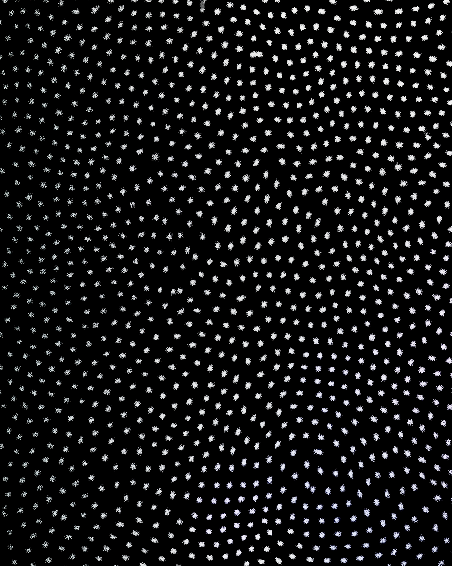 Abstract black and white pattern with star-like shapes in a swirling arrangement, evoking a cosmic or galactic feel.