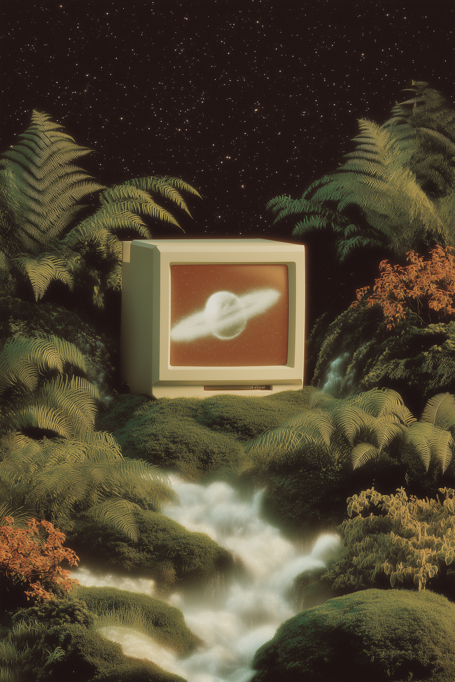 A vintage computer monitor in a lush jungle setting, displaying a planet with rings, under a starry night sky.