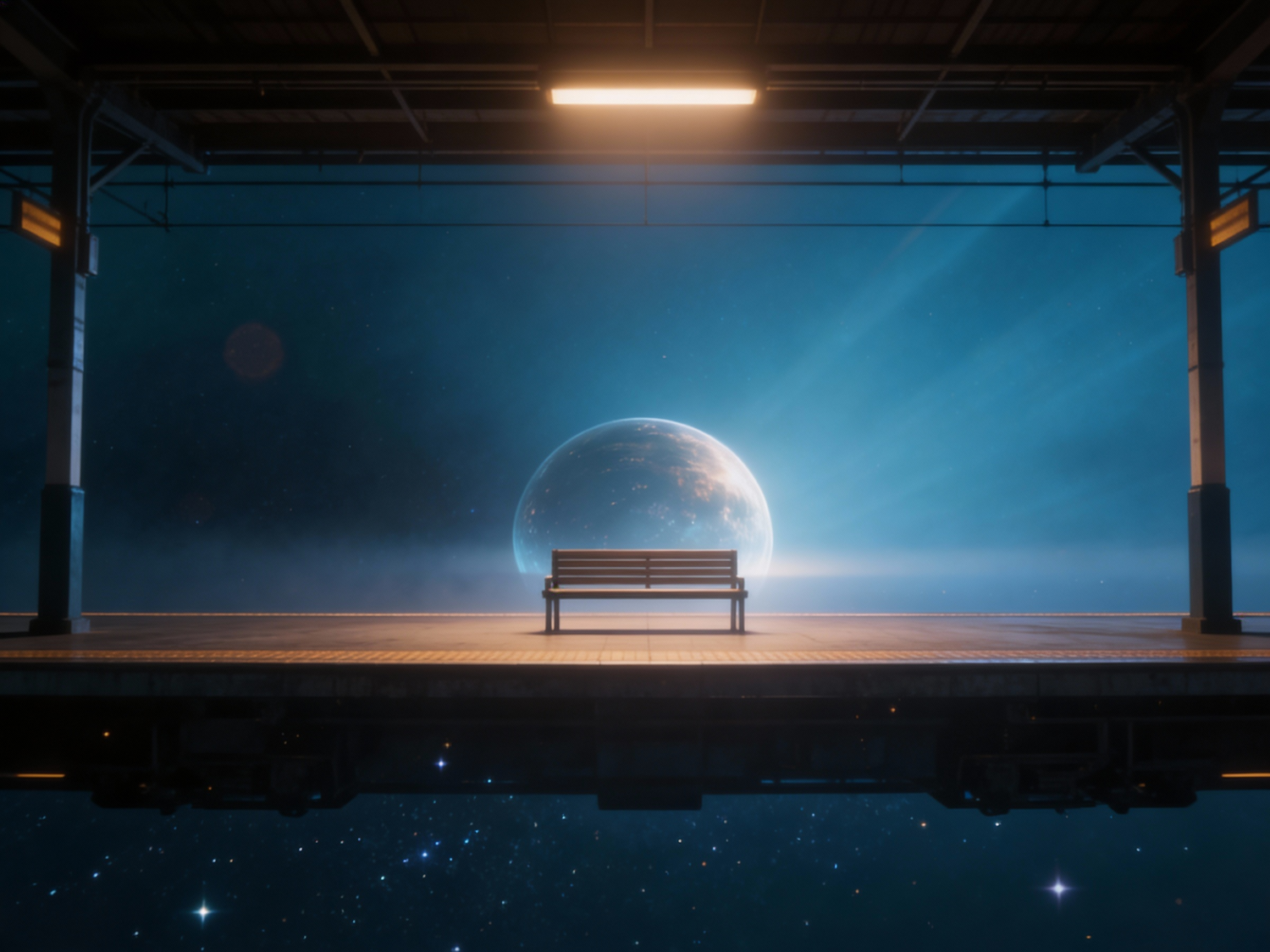A surreal train station platform with a bench, set against a cosmic backdrop featuring a glowing planet and stars.