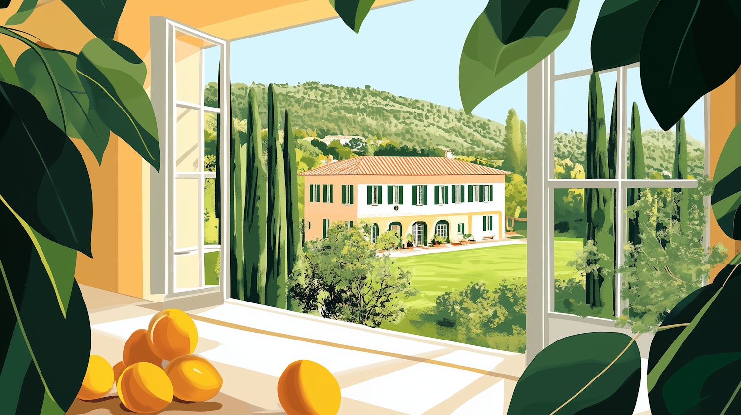 Open window view of a villa with terracotta roof, surrounded by lush greenery and oranges on the sill, evoking Mediterranean charm.