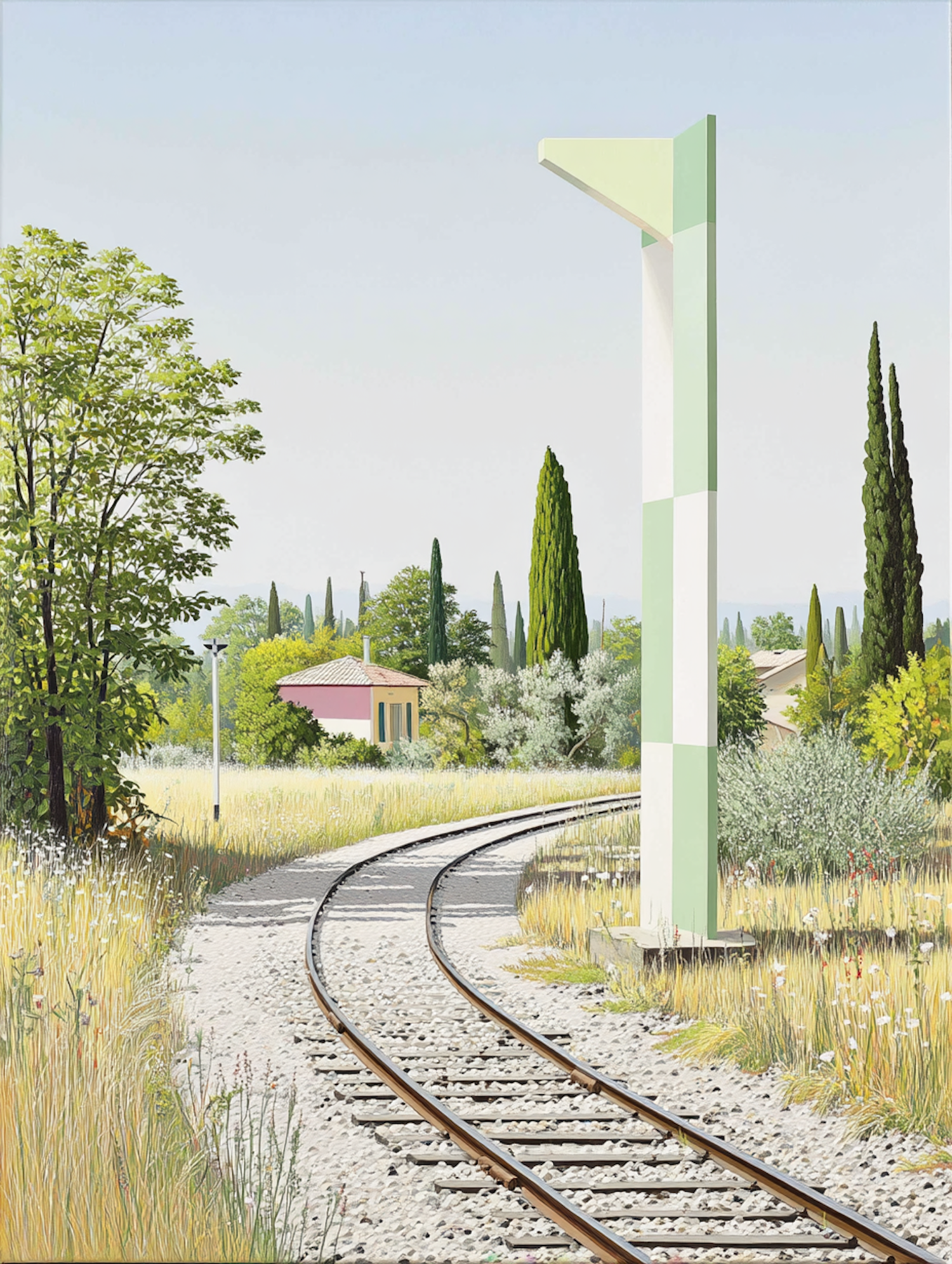 A peaceful countryside railway with curving tracks, wildflowers, a modern column, and a quaint house surrounded by lush greenery.