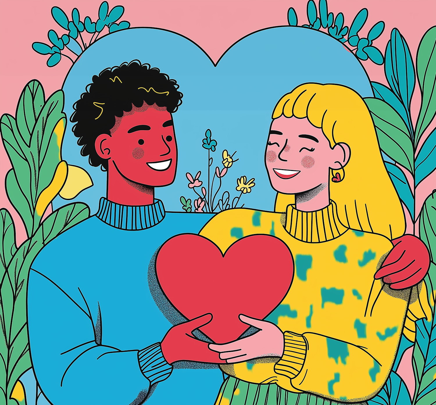 Colorful illustration of a couple holding a heart, surrounded by plants and flowers, symbolizing love and happiness.
