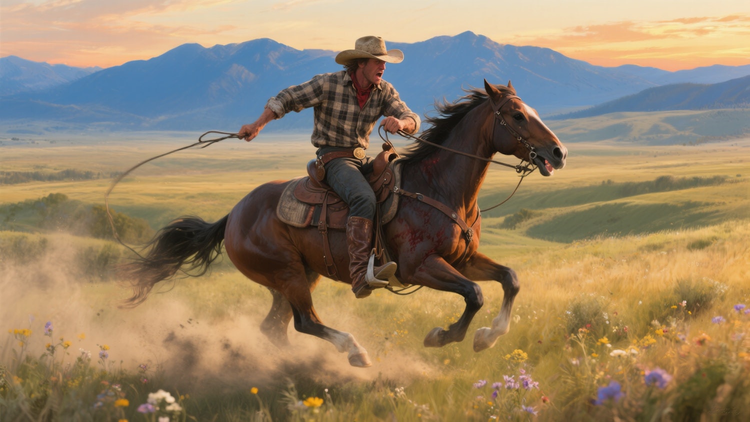 Cowboy galloping on a horse through a scenic field at sunset, surrounded by wildflowers and mountains in the distance.